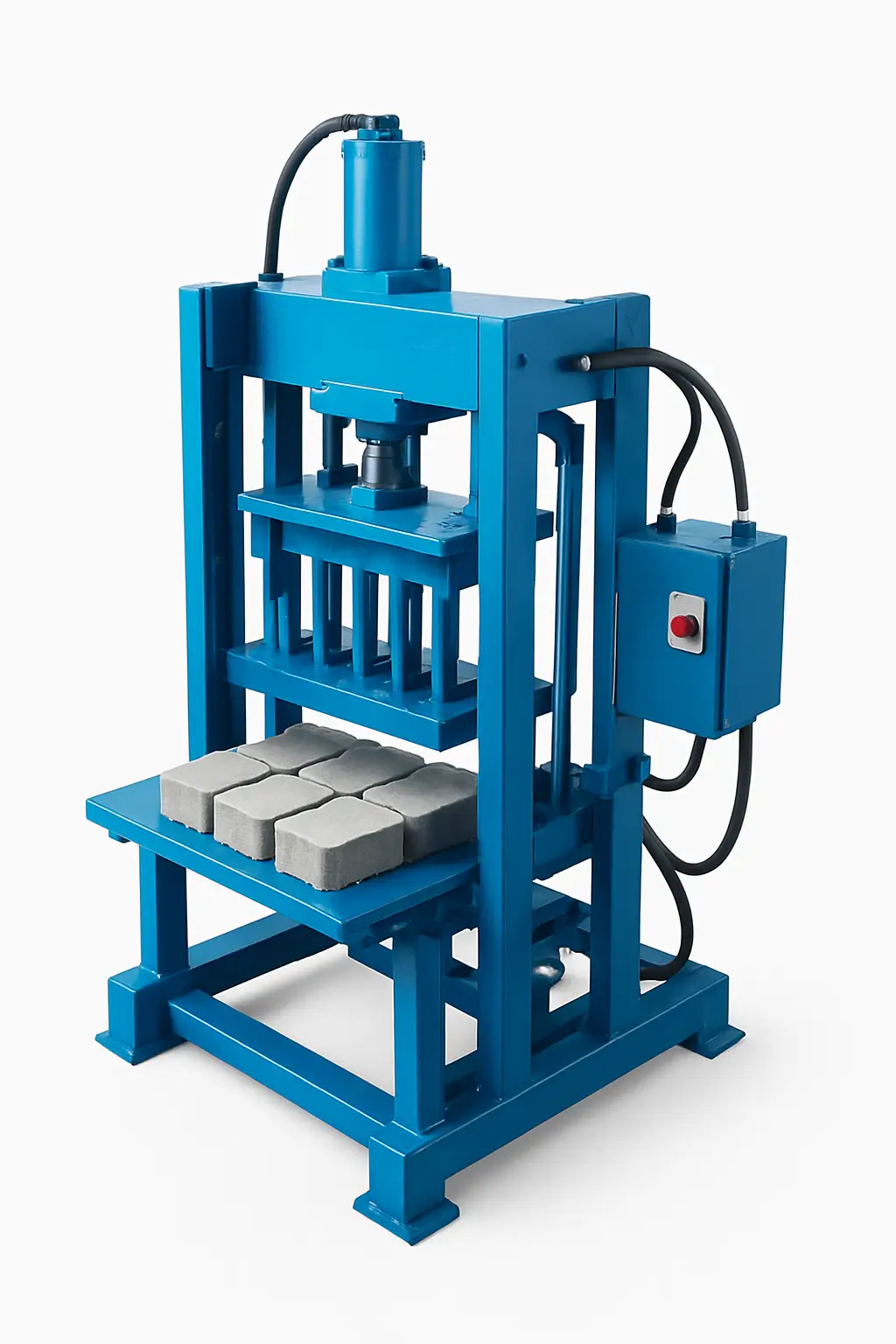 Steel-frame press that can be used for interlocking bricks.